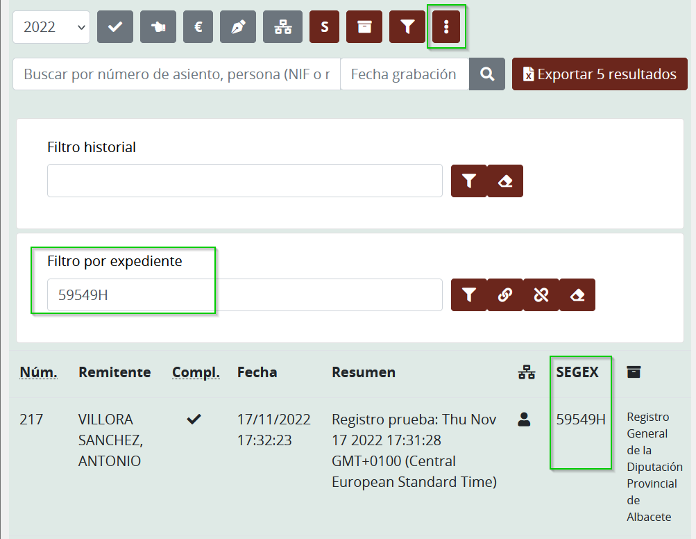 Dentro de los filtros varios de los registros ahora se pueden filtrar los asentos por expediente SEGEX. También se añade un filtro de asientos que no tienen asociados ningún SEGEX.